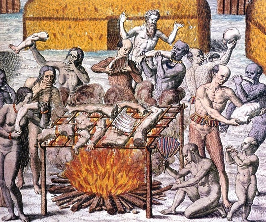 Esse cenário, que poderia fazer parte de um roteiro cinematográfico, é, na realidade, uma gravura documentada em uma carta de Américo Vespúcio enviada à Europa em meados de 1509. Assim como esse, inúmeros relatos de casos de canibalismo na América e na África serviam como alerta aos futuros colonizadores, difundindo a fama dos povos consumidores de carne humana. Tais relatos fazem parte do acervo estudado pelo historiador colombiano Yobenj Aucardo Chicangana-Bayana, na obra Imagens de Canibais e Selvagens do Novo Mundo – do maravilhoso medieval ao exótico colonial (séculos XV – XVII), publicada pela Editora Unicamp.