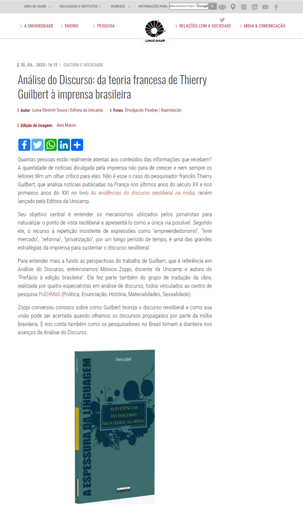 Entrevista sobre o livro As evidências do discurso neoliberal na mídia com Mónica Zoppi, coordenadora da coleção Espessura da Linguagem, foi publicada no Jornal da Unicamp em 30 de julho de 2020.