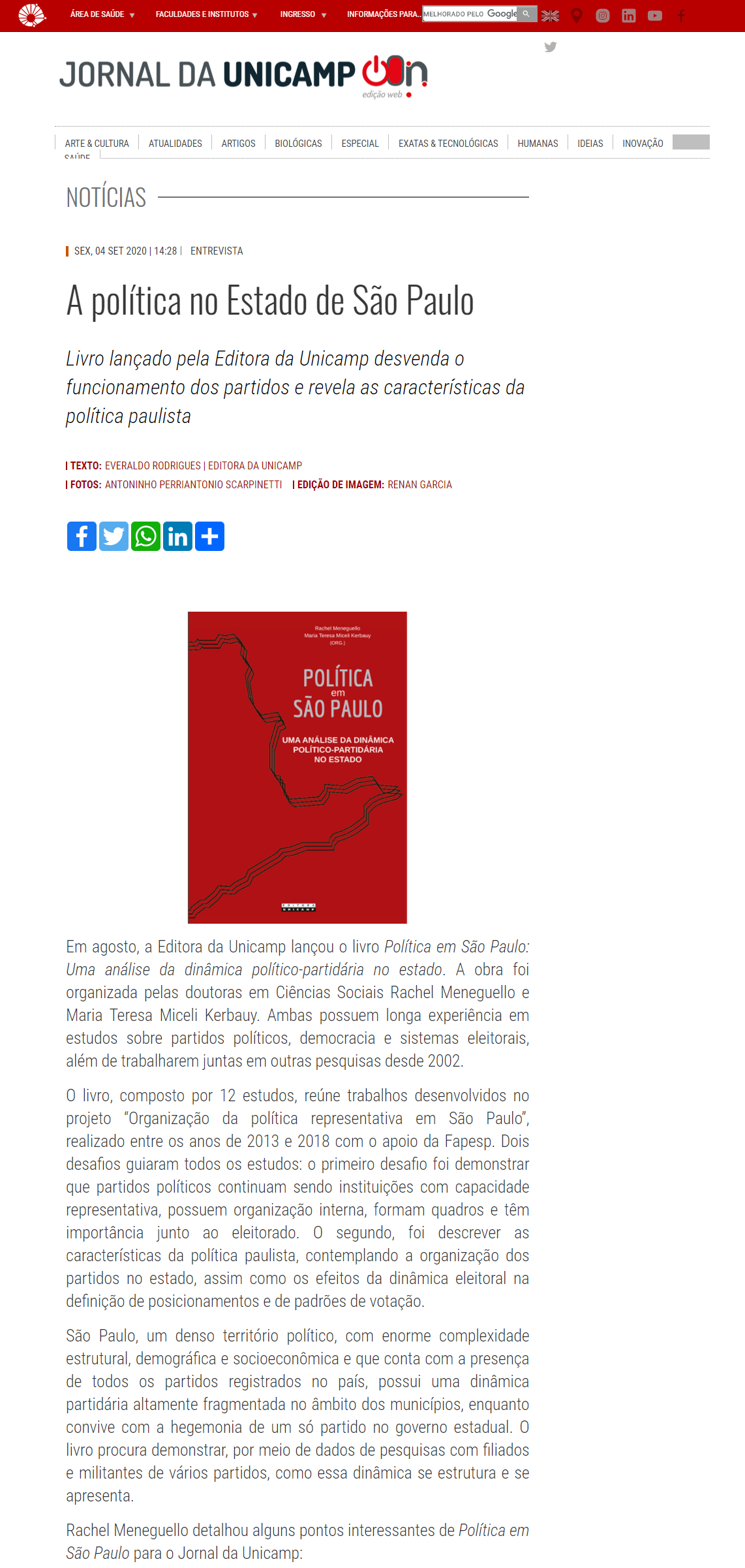 Entrevista sobre o livro Política em São Paulo: Uma análise da dinâmica político-partidária no Estado, organizado pelas doutoras em Ciências Sociais Rachel Meneguello e Maria Teresa Miceli Kerbauy, foi publicada no Jornal da Unicamp em 04 de setembro de 2020.