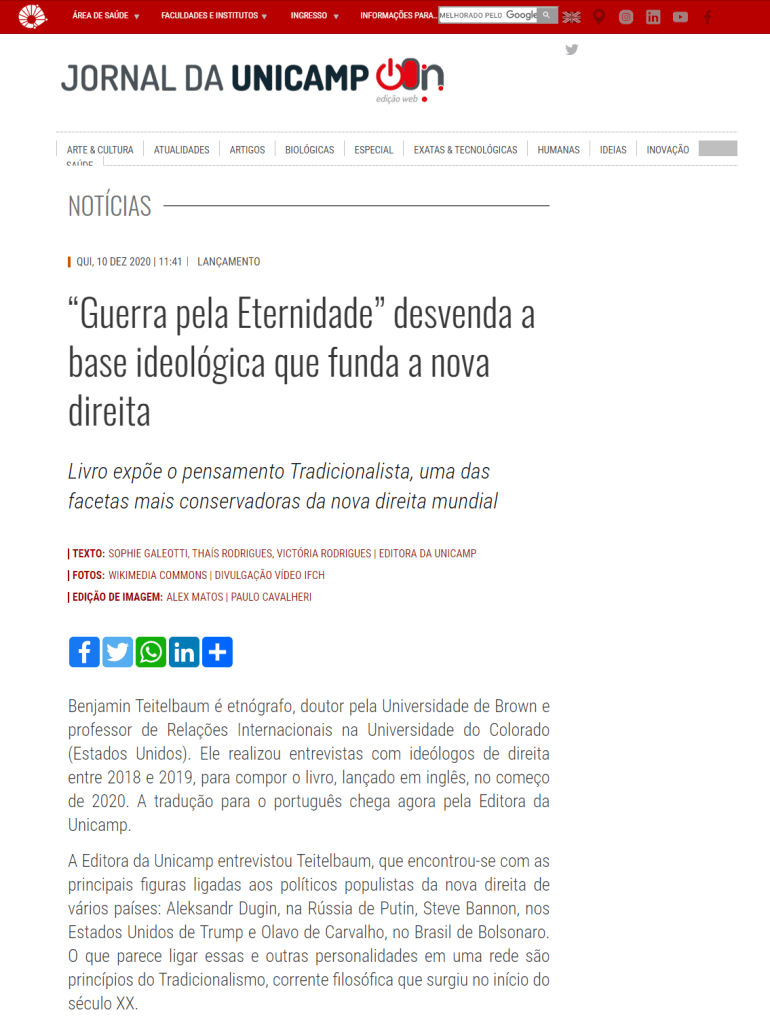 Entrevista sobre o livro Guerra pela eternidade, escrito por Benjamin R. Teitelbaum, foi publicada no Jornal da Unicamp em 10 de dezembro de 2020.