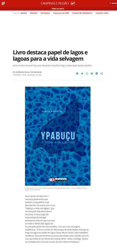 Matéria sobre o livro Ypabuçu, a vida nas lagoas, de Marcos Rodrigues, foi publicada no Portal G1 em 14 de setembro de 2022.
