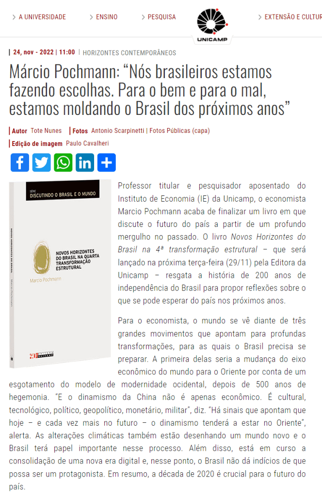 Com o lançamento do livro de Márcio Pochmann, a Editora dá início à publicação das 15 obras aprovadas no edital realizado em comemoração aos seus 40 anos, completados em 2022, segundo informa a diretora, Edwiges Morato. Com o edital, a Editora procurou estimular docentes e pesquisadores doutores da Unicamp a apresentarem propostas para a publicação de obras monográficas ou de coletâneas.