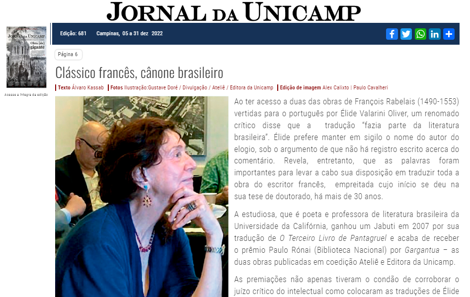 Élide Valarini Oliver – O que me impeliu, durante todos esses anos, foi justamente o desafio da fidelidade. Sem isso, traduzir perde a graça. Se você, a cada desafio, suprime, adapta, inventa qualquer coisa, então não dá. Não faz parte do jogo da tradução. Esse jogo tem regras estritas, mas não escritas, sobretudo no caso do Rabelais, em que a quantidade de paronomásias e os mais incríveis jogos de palavras estão ligados umbilicalmente ao conteúdo