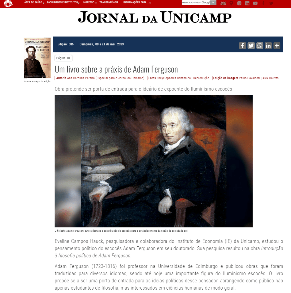 Eveline Campos Hauck – Como eu disse anteriormente, Ferguson escreveu em uma época em que as ciências humanas — aplicadas ou não — eram tratadas enquanto filosofia. Portanto, creio que a filosofia fergusoniana possa interessar a todo o campo, hoje subdividido, das humanidades. É claro que, pela relevância do Iluminismo escocês para a história da filosofia, talvez os estudantes de filosofia sejam o público-alvo imediato, mas, de modo geral, uma “introdução” ao pensamento político de Ferguson deve interessar a todos aqueles envolvidos com a história do pensamento social.