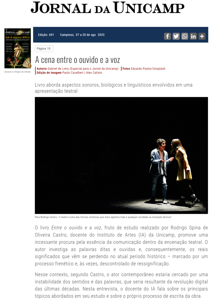 Rodrigo Castro – O livro tem como tema maior as pesquisas vocais nas artes cênicas, mas a escrita teve que ser amparada por outros campos do saber, o que o torna mais plural e de alcance maior. Assuntos científicos e das humanidades integram também o escopo do livro, entre os quais fonoaudiologia, psicologia, antropologia, filosofia, além dos estudos mais teóricos das artes cênicas. Sinto que todo leitor que tenha interesse pelas percepções humanas, pela voz (em termos fisiológicos e poéticos), pelo teatro e pela cultura como um todo poderá se beneficiar com a leitura da obra.