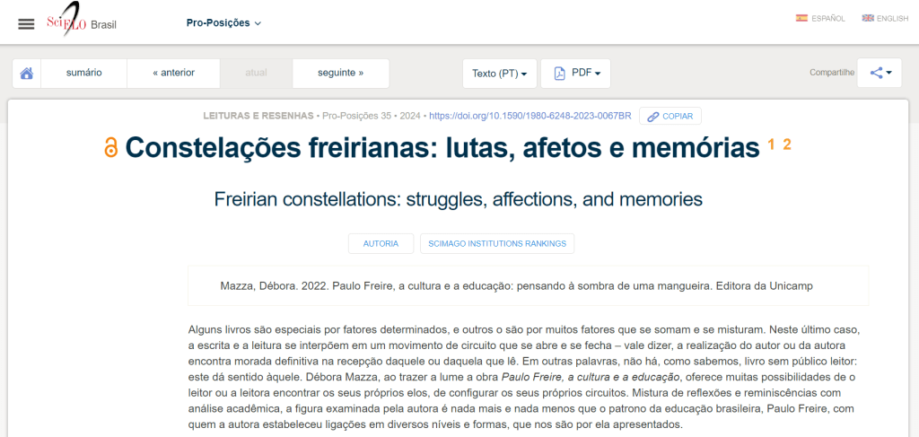 O autor e a coautora desta resenha prontamente se reconhecem na obra, nos termos acima mencionados. Colega de Débora no Departamento de Ciências Sociais na Educação da Faculdade de Educação da Unicamp, ao qual o próprio Paulo Freire esteve ligado, o autor se vê quase que pessoalmente imbricado em muitos dos aspectos analisados no livro, em especial os institucionais; de outro lado, a coautora da resenha, aluna de doutorado no mesmo departamento e instituição, encontra no livro tanto o Paulo Freire educador, figura quase mítica, como o professor que percorreu os corredores e salas de aula que ela mesma percorre agora. Sobretudo, um e outra tomam contato com o intelectual, mas também com o ser humano de carne e osso cuja face humana poucas pessoas poderiam retratar com tamanha minúcia como o faz Débora Mazza.
