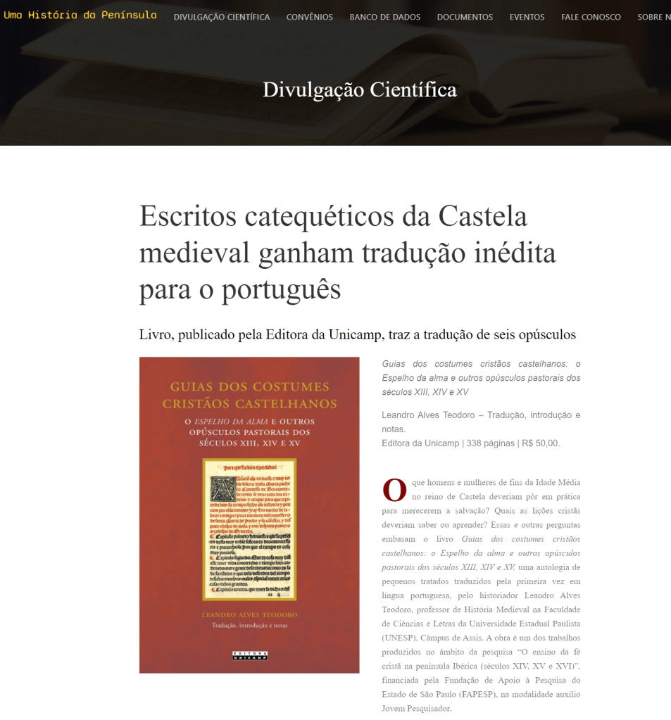 » O ensino da fé cristã na península Ibérica, sécs. XIV, XV e XVI (FAPESP n. 1711111-9). Modalidade: Jovem Pesquisador. Pesquisador responsável: Leandro Alves Teodoro (Unesp-Assis).