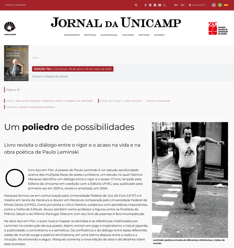 Fabrício Marques – Foi um processo prazeroso, motivado pela efeméride dos 80 anos de nascimento do poeta, que aconteceu em 24 de agosto. A primeira edição saiu em 2001. Nesse período de 23 anos até a reedição, confesso que deixei Leminski um pouco “de lado”, pois, além de pesquisador, sou jornalista e professor, e outras demandas e pautas surgiram no caminho. Mas tudo que lemos e que importa fica marcado a fogo em nós. Quando reli o livro para preparar a nova edição, naturalmente voltei a ter contato com os poemas e outros textos de Leminski e de novo me vi diante de uma obra múltipla, instigante, sempre em construção. Para completar, o fato de se tratar de uma coedição da Editora da Unicamp e da Editora UFMG é algo que me deixou bastante satisfeito, pois admiro muito as duas editoras.