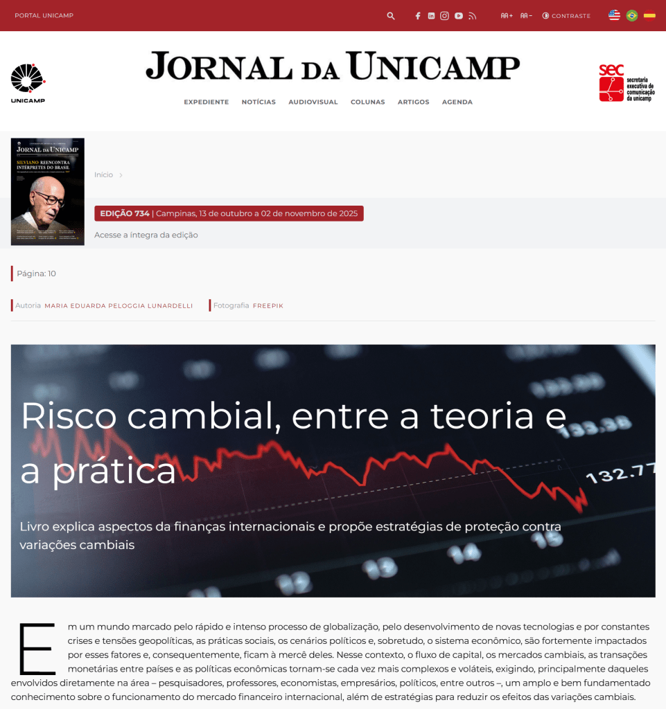 Natalia Dus Poiatti — A volatilidade cambial impacta a economia em diversos âmbitos, como comércio internacional, fluxos financeiros, investimento produtivo, inflação e desigualdade de renda, tendo relevância significativa nas decisões de empresas, investidores e na formulação de políticas públicas. Assim, o livro Redução de exposição ao risco cambial pode contribuir significativamente para a formação de estudantes de economia, administração, contabilidade, finanças, relações internacionais e políticas públicas, oferecendo uma abordagem integrada entre teoria e aplicação prática. O leitor aprenderá o significado teórico do risco cambial, a mensuração da exposição cambial e seu gerenciamento por meio dos instrumentos financeiros mais apropriados. O conteúdo teórico e empírico permitirá que o leitor enfrente o tema com responsabilidade estratégica, reduzindo a exposição de fluxos financeiros a elevados riscos cambiais que caracterizam a economia internacional.