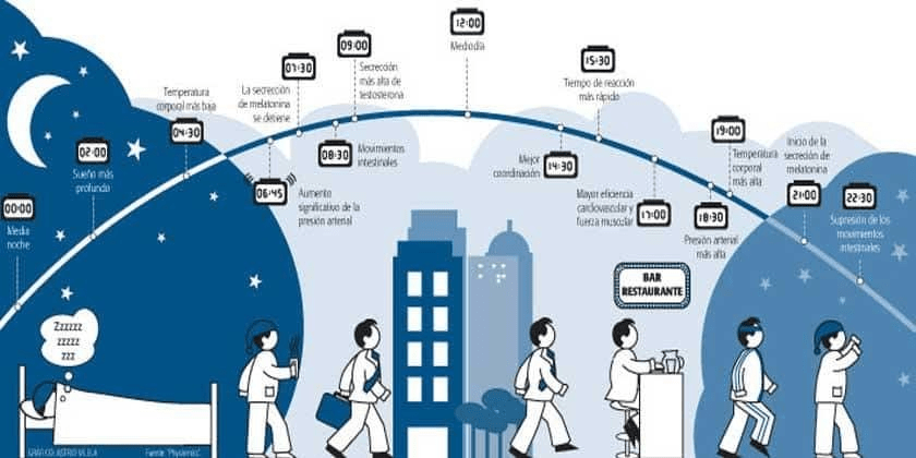 Apesar de termos horários distintos para determinadas tarefas, organizamos nossas vidas dentro das mesmas 24 horas. Alguns acordam às 5h para poder entrar no trabalho às 7h, almoçam em torno do meio-dia, chegam em casa após o serviço às 18h, dedicam tempo ao lazer e aos cuidados pessoais e vão dormir às 22h. Já outros acordam às 8h, têm maior flexibilidade nos horários e vão dormir bem mais tarde, pois a rotina, os compromissos e o ritmo dessas pessoas assim permitem. Esse mecanismo de funcionamento dos corpos dentro de 24 horas é chamado “relógio biológico” e, por conta dele, o rendimento das pessoas varia em determinados períodos do dia.