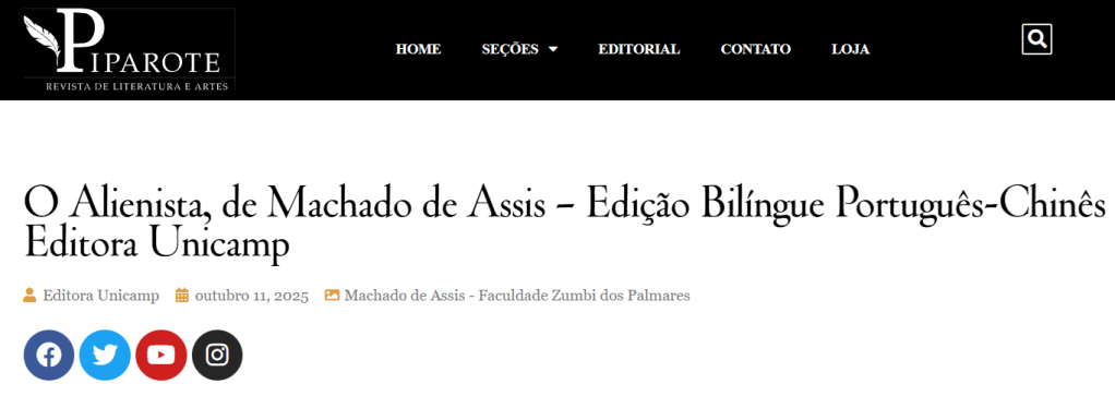 Nesta edição bilíngue português–chinês, publicada pela Editora da Unicamp, o clássico machadiano ganha nova dimensão internacional. A tradução para o chinês, assinada por Min Xuefei, permite que leitores de outra tradição cultural acessem a sofisticação narrativa, o humor corrosivo e a ambiguidade moral que fazem de Machado um autor universal. O volume conta ainda com apresentação de Paulo Franchetti, que contextualiza a obra e ilumina suas camadas críticas.