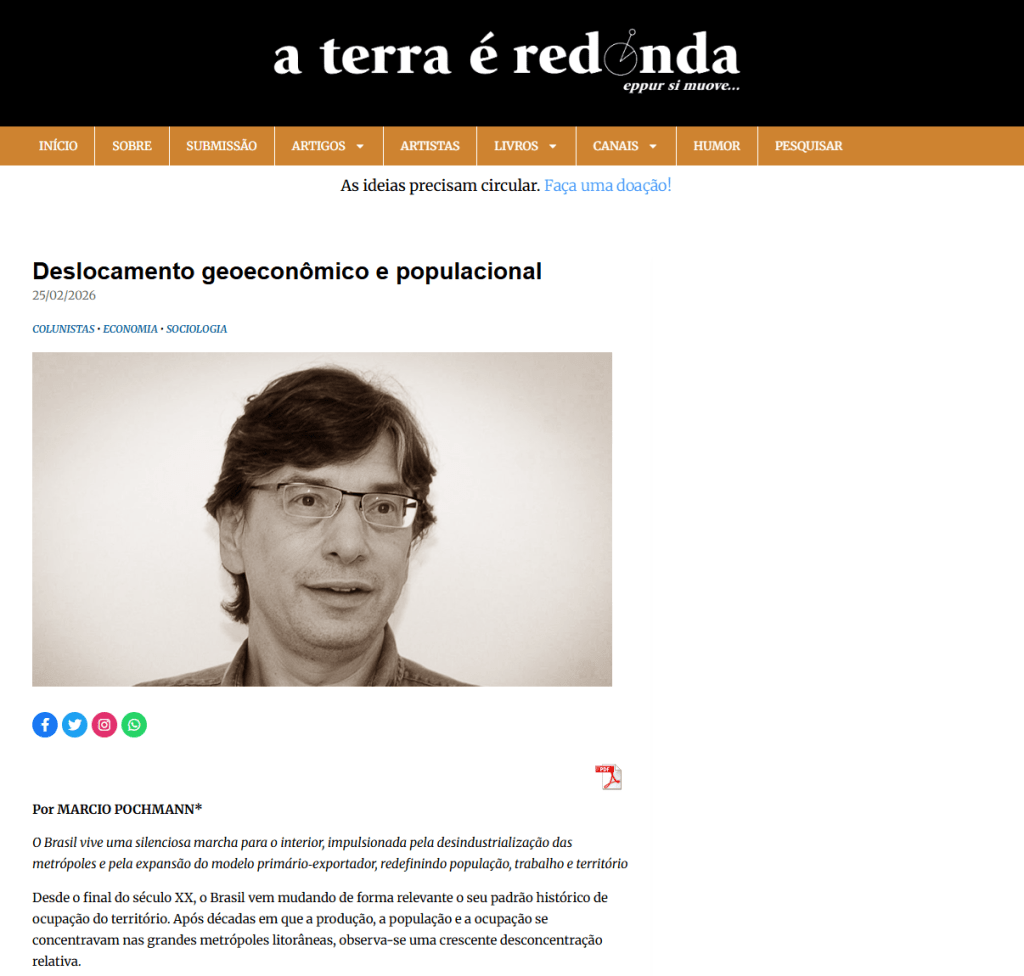 *Marcio Pochmann, professor titular de economia na Unicamp, é o atual presidente do IBGE (Instituto Brasileiro de Geografia e Estatística). Autor, entre outros livros, de Novos horizontes do Brasil na quarta transformação estrutural (Editora da Unicamp).